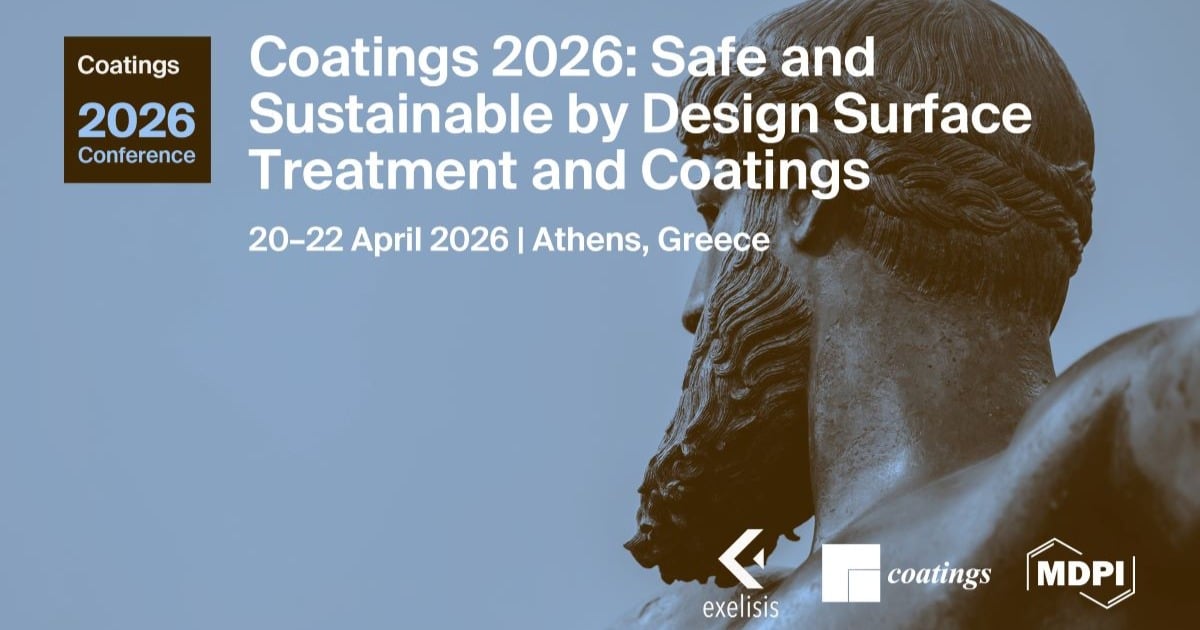 We are pleased to announce the international conference Coatings 2026: Safe and Sustainable by Design Surface Treatment and Coatings”, which will be held in Athens, Greece from 20–22 April 2026. This event is co-organised by co-organized by MDPI and EXELISIS, and supported by several EU-funded projects.